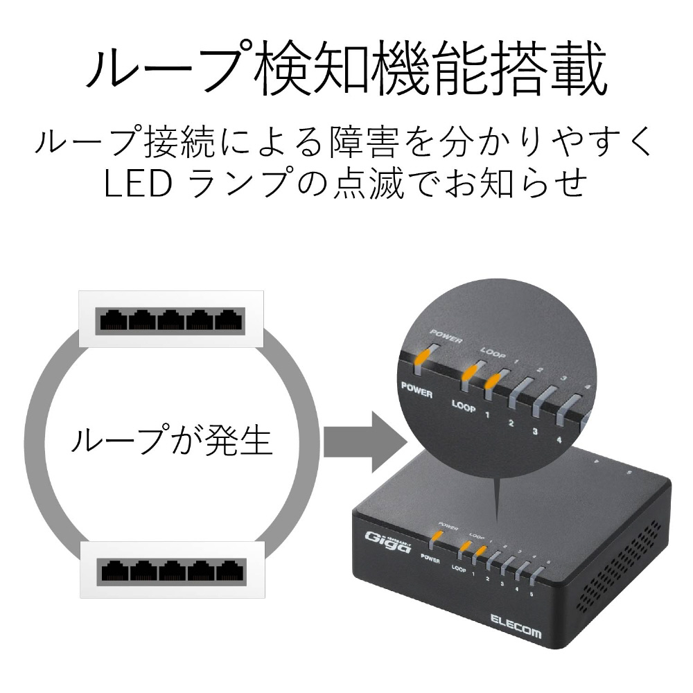1000BASE-T対応のACアダプター電源のプラスチック筐体5ポートスイッチングハブ。省エネ法に準拠したエコ省電力タイプで、ループ検知機能も搭載しています。マグネット付きモデル。(ブラック)