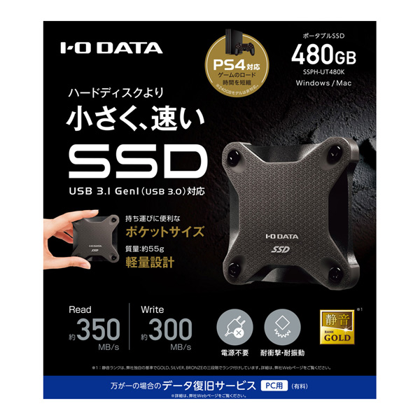 商品名 USB 3.1 Gen 1(USB 3.0)/2.0対応ポータブルSSD PS5対応 480GB ブラック SSPH-UT480K