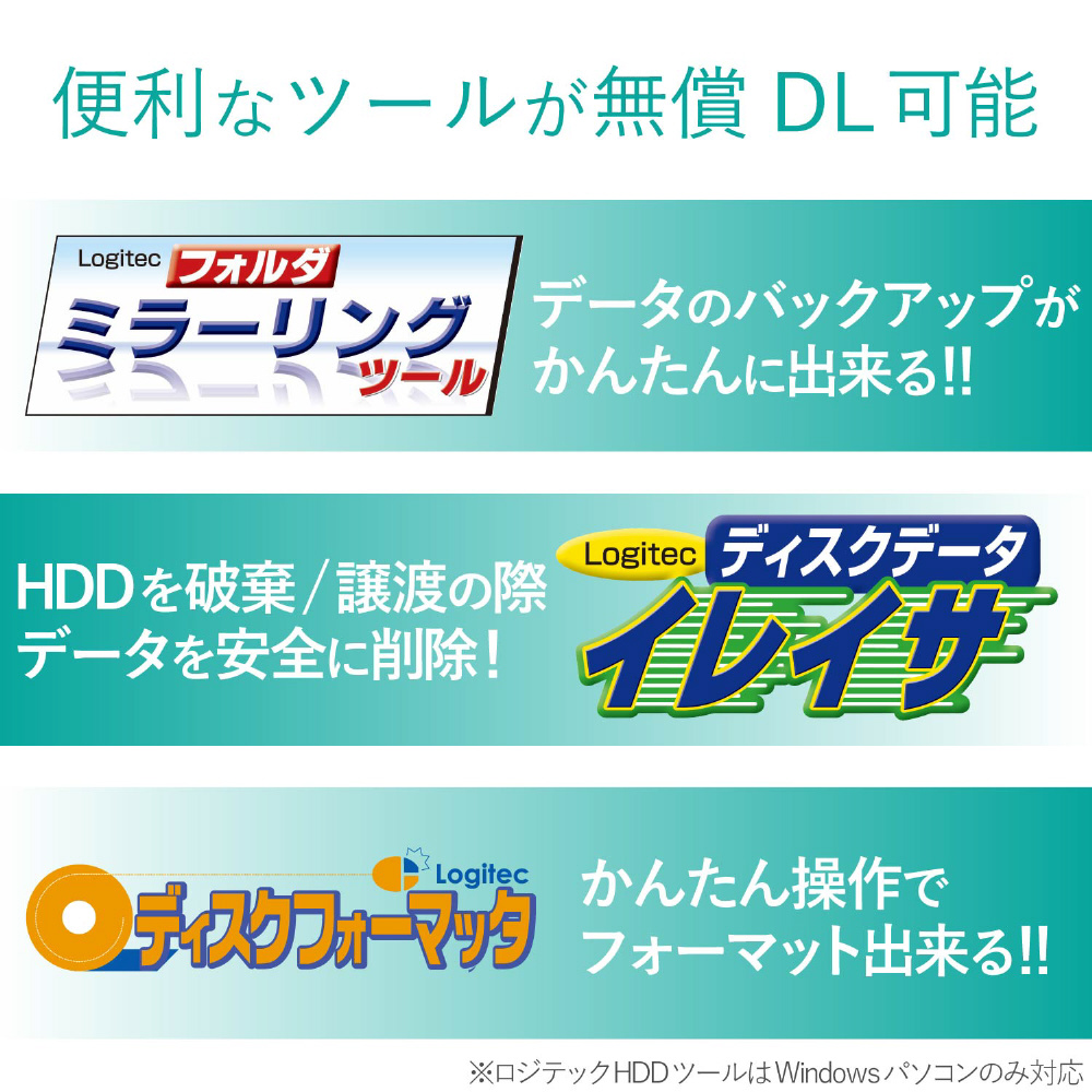 ■「Logitecディスクフォーマッタ」、「Logitecディスクイレイサ」、「Logitecミラーリングツール」の3種類のロジテックオリジナルツールを付属。ハードディスクをより便利にご使用いただけます。