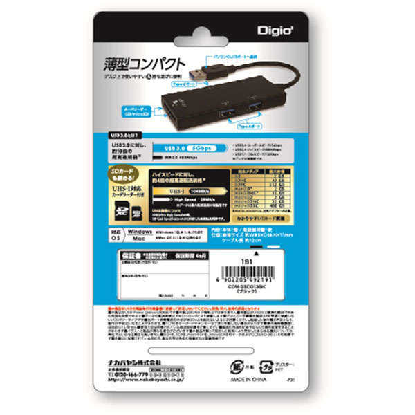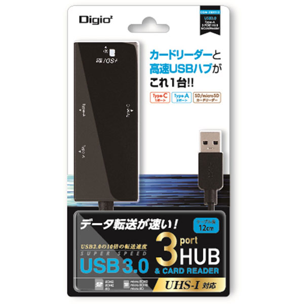 COM-3SD013BK USB3.0 コンボハブ SDカードリーダー対応 [3ポート] ブラック