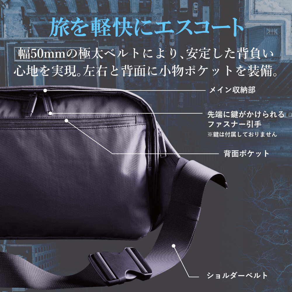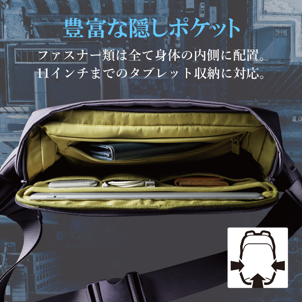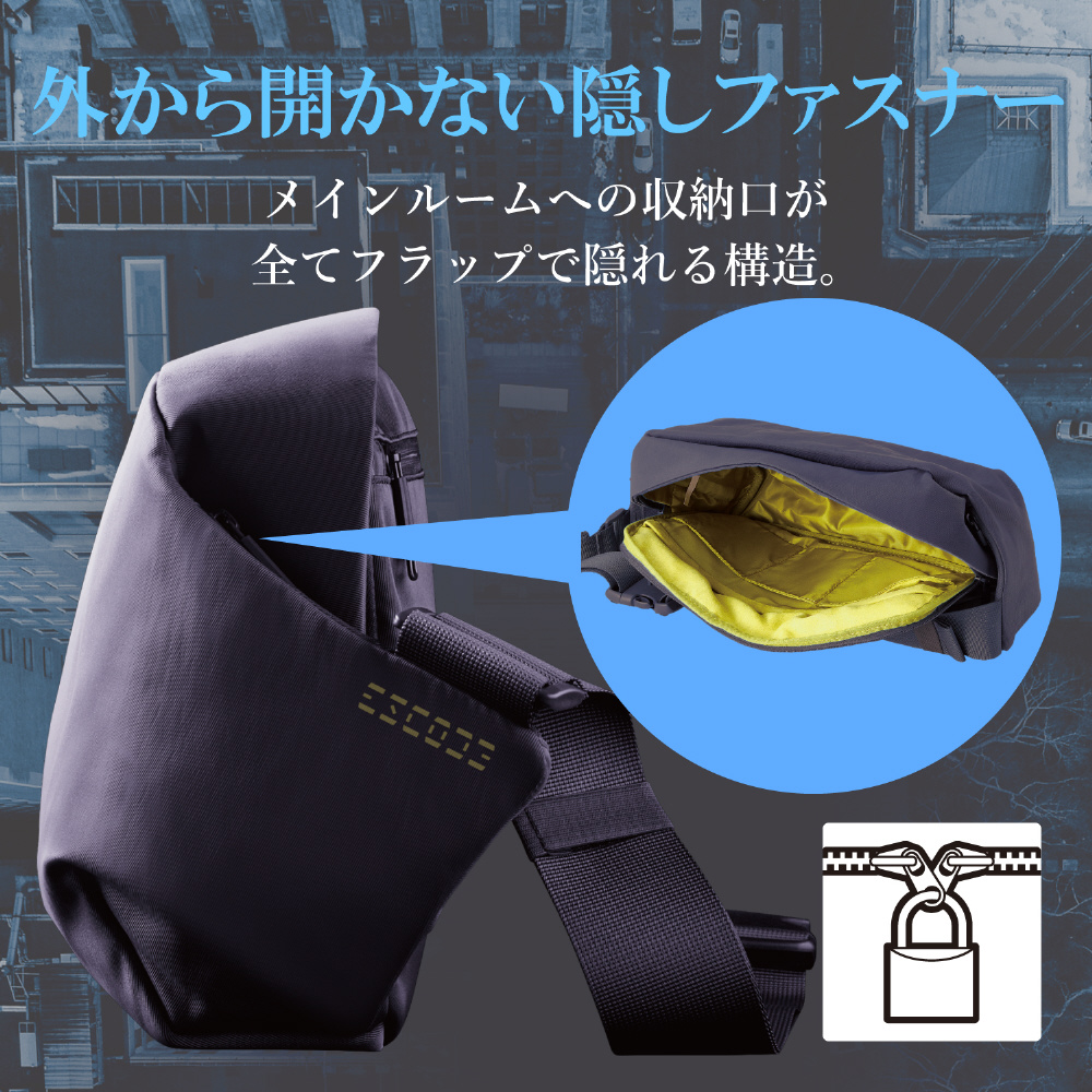 もう、背後は気にならない。 ファスナーが外に露出しないフラップ機構と、カッターなどの脅威から守る防刃生地を芯材に採用したメッセンジャーバッグタイプの防犯バッグ“ESCODE(エスコード)”。