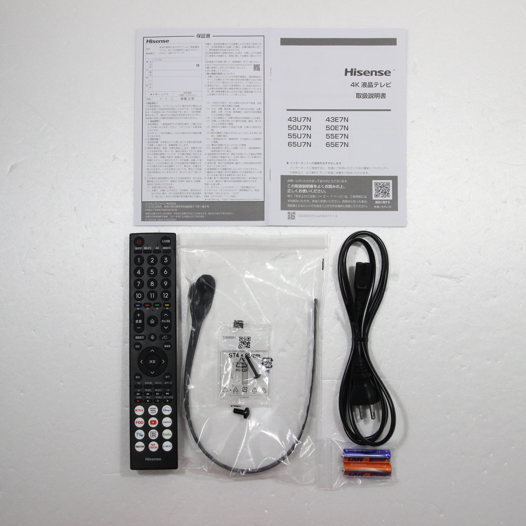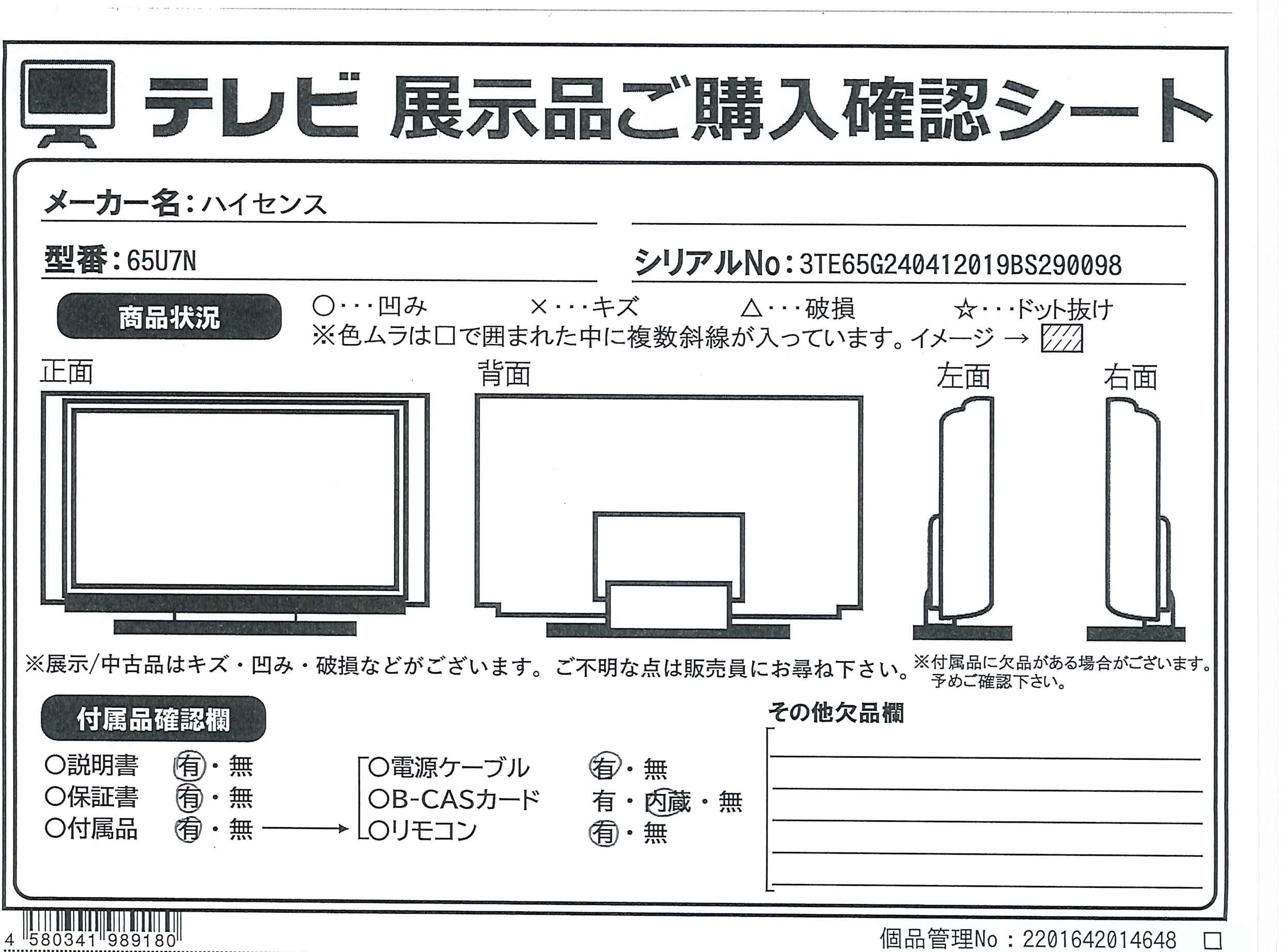 中古商品ランクについて 付属品・商品状態について 〔付属品〕説明書、スタンド取付説明書、電源コード、リモコン、転倒防止ベルト一式、スタンド一式、リモコン用単3形乾電池×2