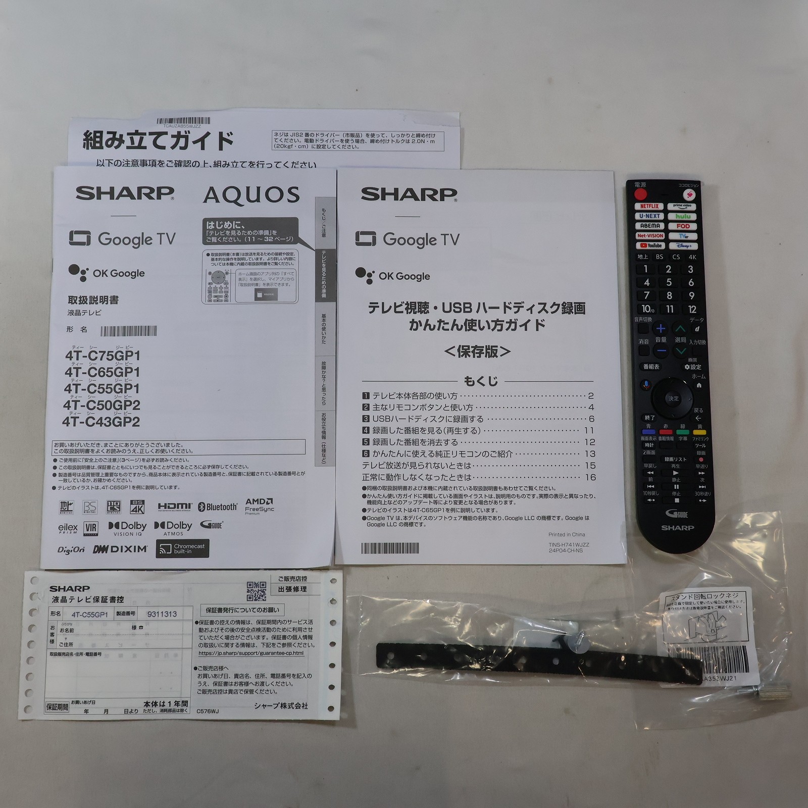 中古商品ランクについて 付属品・商品状態について 〔付属品〕取扱説明書、かんたん使い方ガイド、リモコン、スタンド取付金具、スタンドカバー、スタンドベース、スタンド組立用ネジ M5(長さ 12mm)×4、スタンド取付用ネジ M5(長さ 12mm)×4、転倒防止ベルト、転倒防止ベルトテレビ取付用ネジ M4(長さ 8mm)、転倒防止ベルトテレビ台固定用ネジ M4(長さ 16mm)、スタンド回転ロックネジ