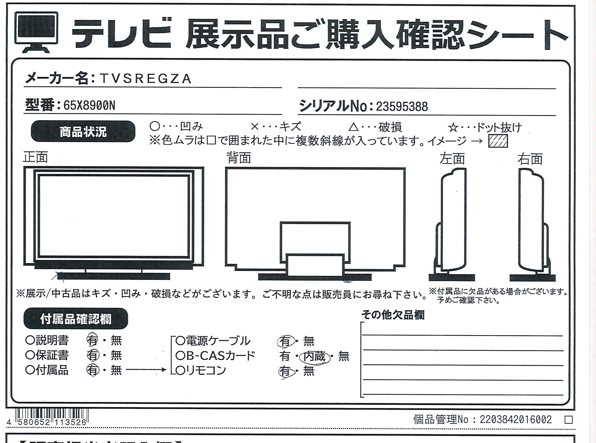 中古商品ランクについて 付属品・商品状態について 〔付属品〕説明書、スタンド一式、リモコン、単四型乾電池×2、電源コード、転倒防止バンド一式、コードクランプ、背面カバー、スタンド背面カバー