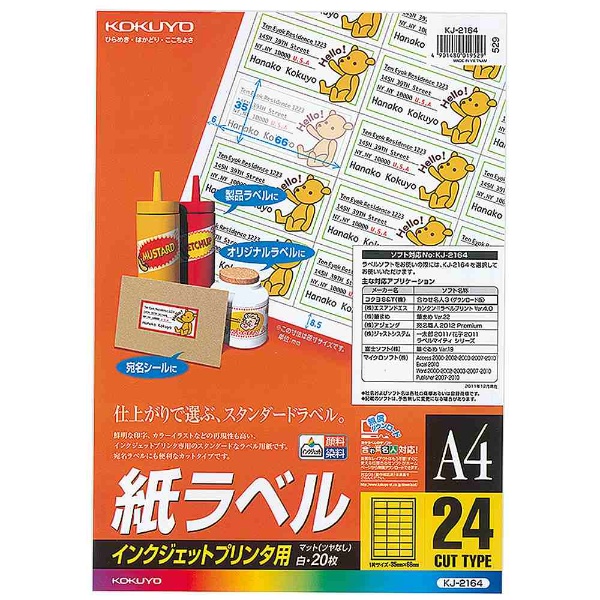 商品名 KJ-2164 インクジェットプリンタ用ラベルシート 〜紙ラベル〜 (A4サイズ・24面・20枚)