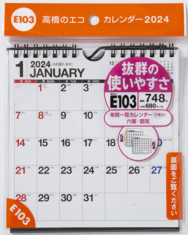 | 商品名 | 2024年1月始まり No.E103 エコカレンダー壁掛・卓上兼用A5変型 |