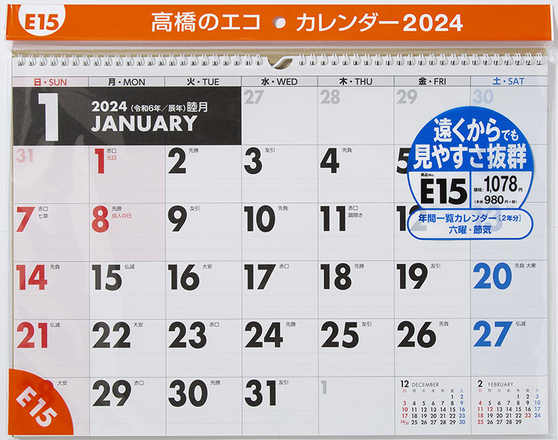 2024年1月始まり No.E15 エコカレンダー壁掛A3