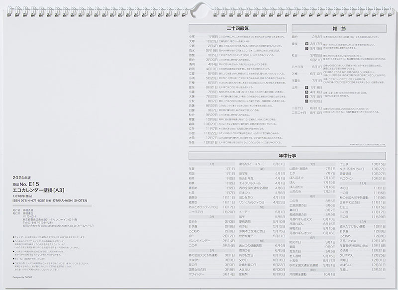 | 商品名 | 2024年1月始まり No.E15 エコカレンダー壁掛A3 |