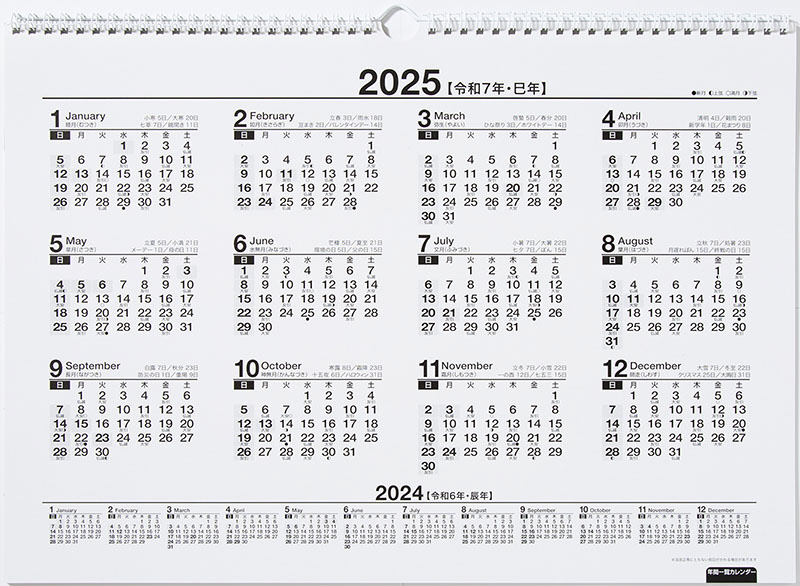 遠くからでも日付と曜日がはっきり分かります。2年分を一覧できる年間カレンダーが付いているので、