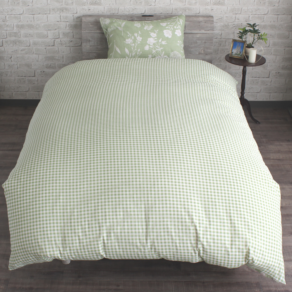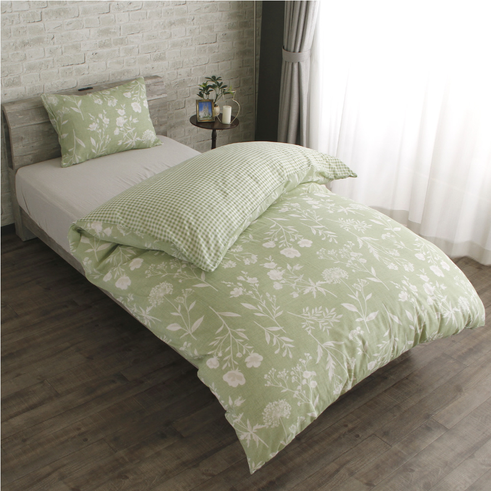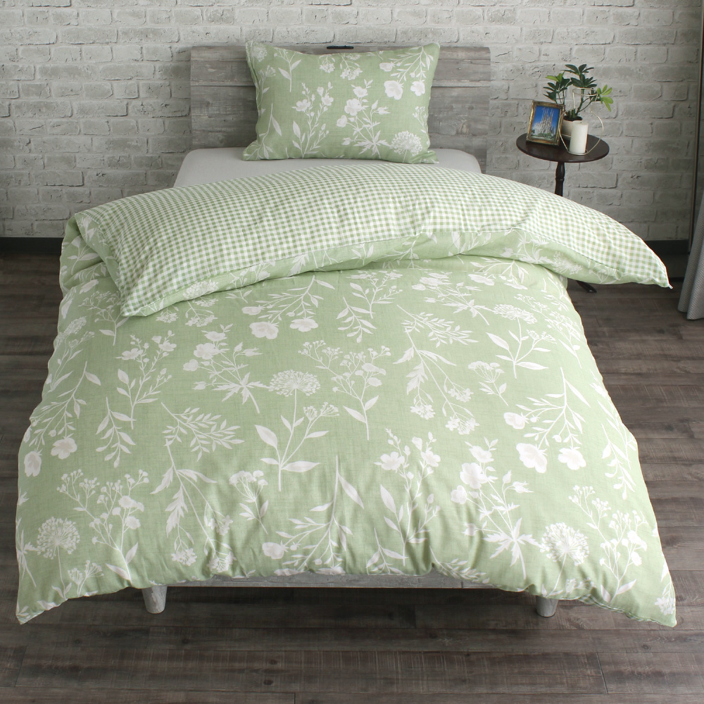 メリーナイト 掛布団カバー ボタニカル/ギンガムチェック グリーン シングルロング 約150×210cm リバーシブル仕様 両面使える 内側スナップボタン8カ所付き 着脱簡単 綿混素材 速乾 衛生 清潔 MerryNight