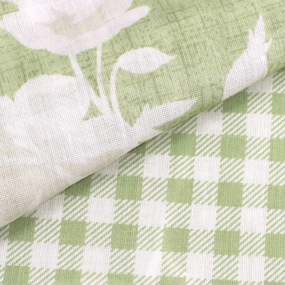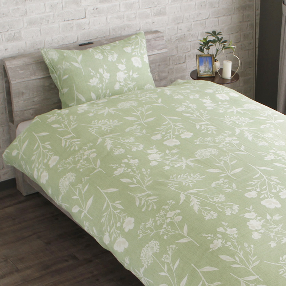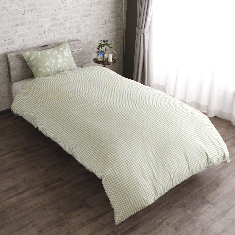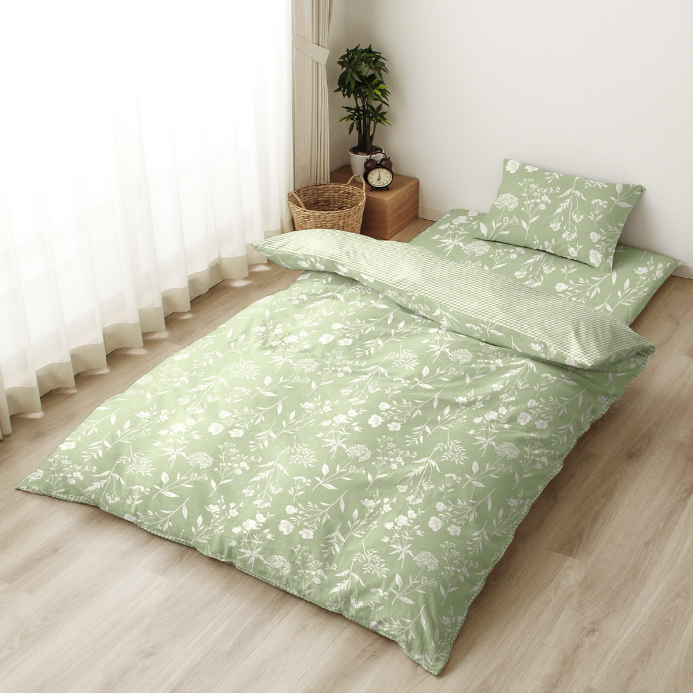 メリーナイト 掛布団カバー ボタニカル/ギンガムチェック グリーン シングルロング 約150×210cm リバーシブル仕様 両面使える 内側スナップボタン8カ所付き 着脱簡単 綿混素材 速乾 衛生 清潔 MerryNight
