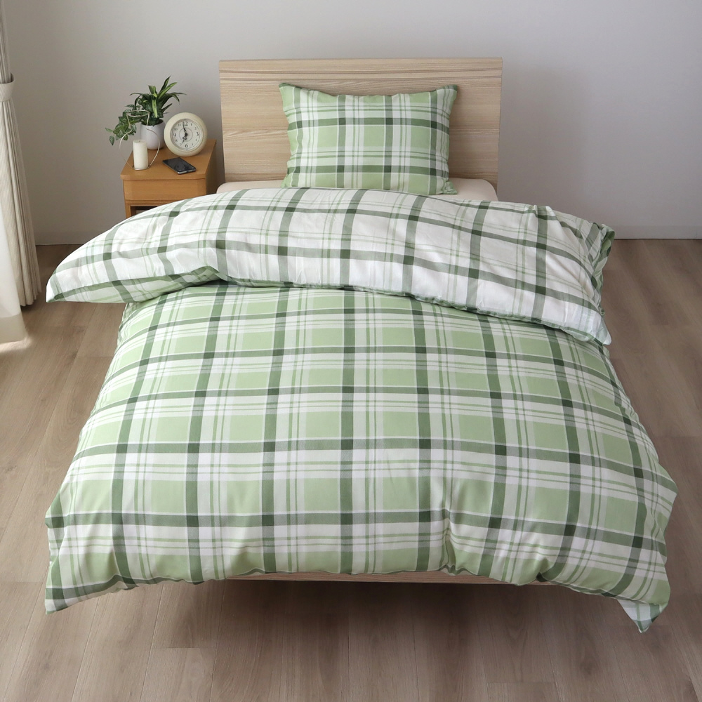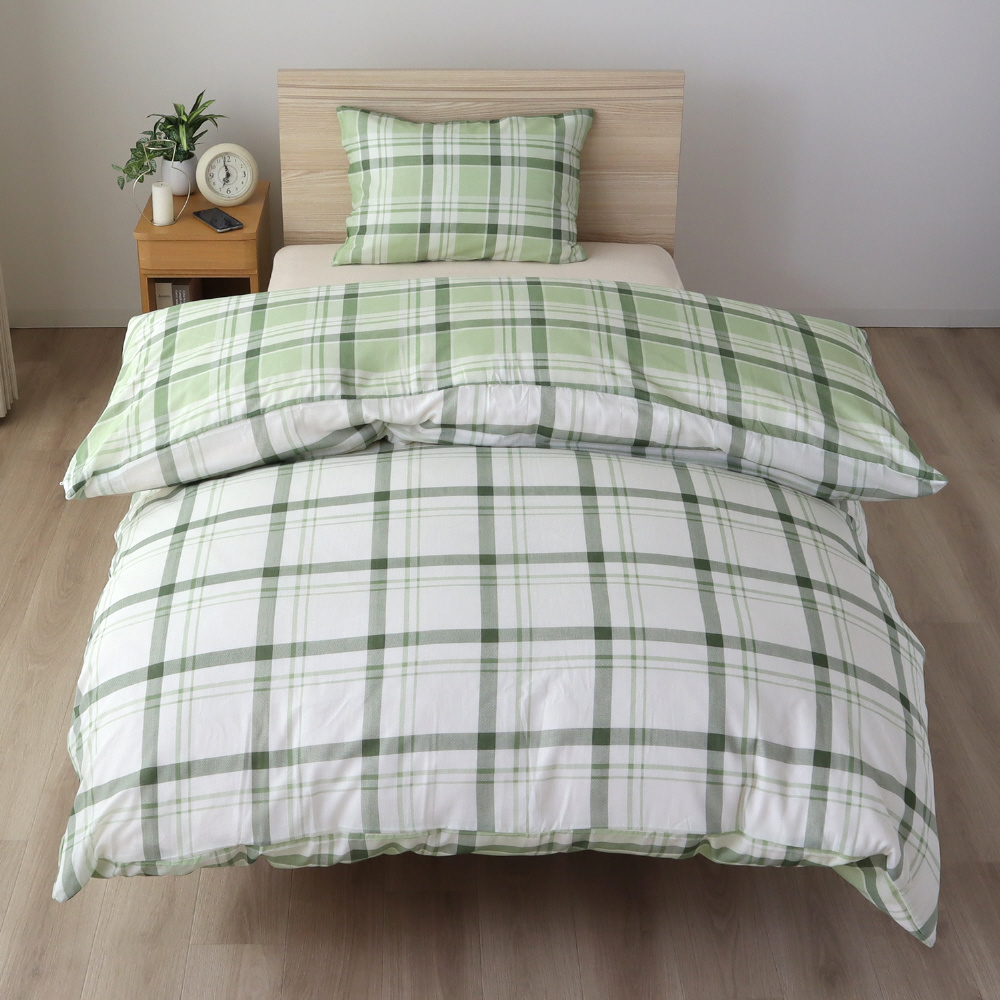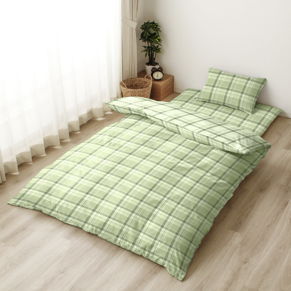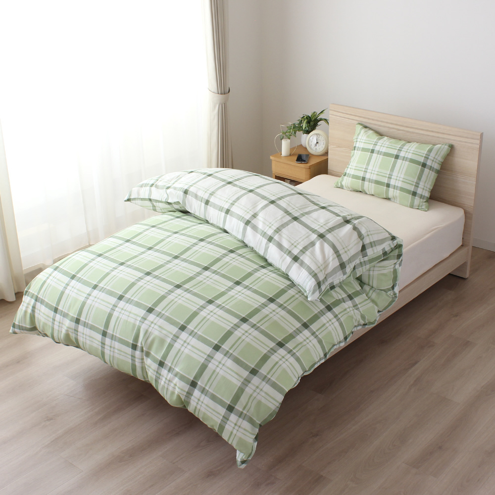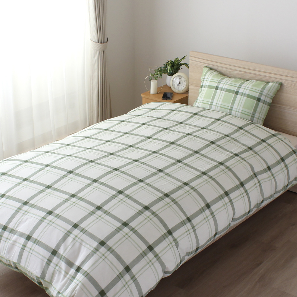 メリーナイト 掛布団カバー 濃淡チェック柄 グリーン シングルロング 約150×210cm リバーシブル仕様 両面使える 内側スナップボタン8カ所付き 着脱簡単 綿混素材 速乾 シワになりにくい 衛生 清潔 MerryNight