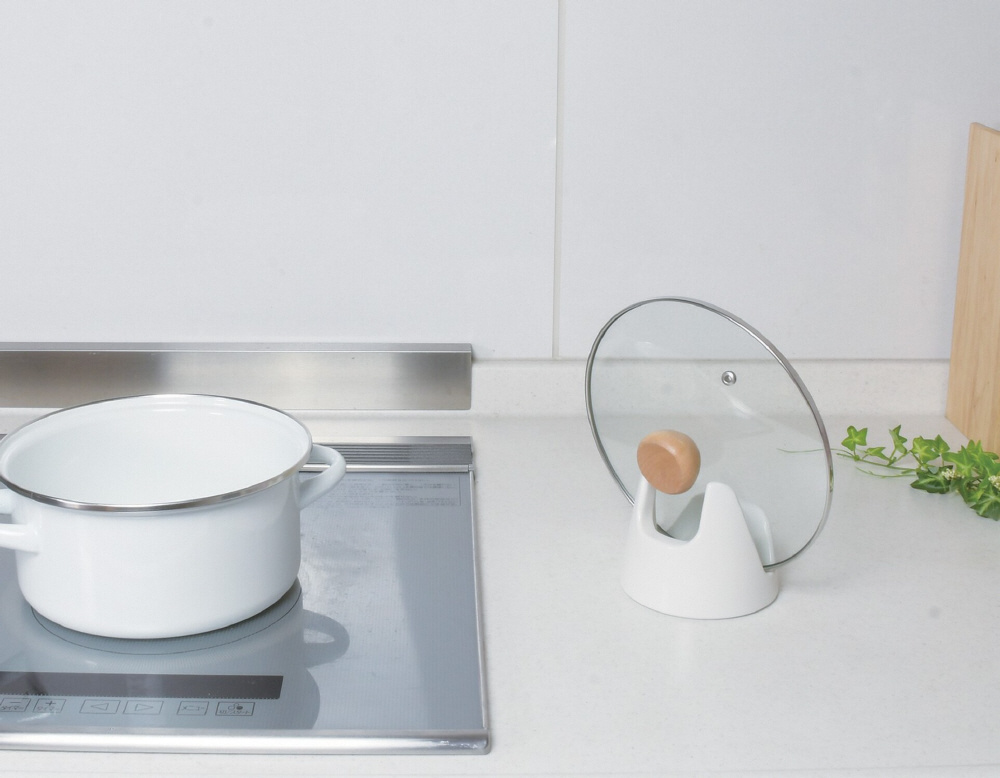 ホワイト調のデザインで使いやすい!ブランキッチン磁器製スタンド!落ち着いた雰囲気のデザインで、キッチンでもおしゃれになじみます。調理中の鍋蓋置きに最適です。ご注意: ひびが入っていたり、欠けているものは危険ですので使用しないでください。蓋スタンドには約14〜30cmの蓋が立てられますが、蓋の形状によっては立てられない場合がございます。