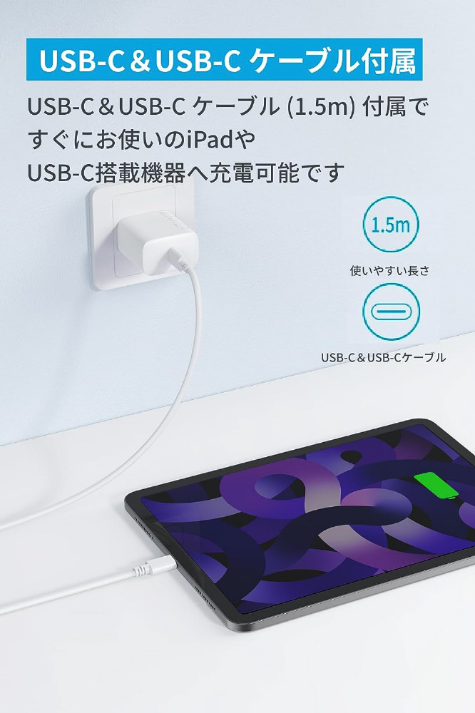 USB-Cケーブル付きで便利。コンパクトな急速充電器