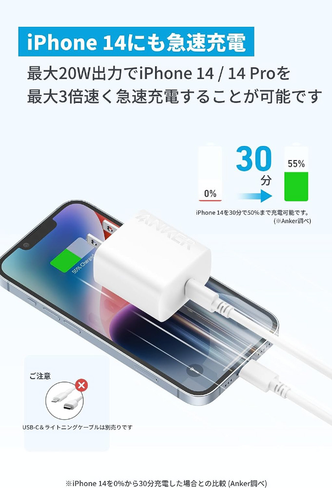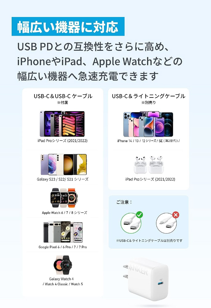 Anker Charger (20W) with USB-C & USB-C ケーブル ホワイト B2347121 [USB Power Delivery対応 /1ポート /20W]