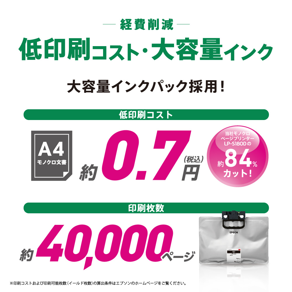 A4モノクロ文書が1枚当たりを約0.7円(税込)という低印刷コストを実現。ビジネスで求められるコスト削減に役立ちます。