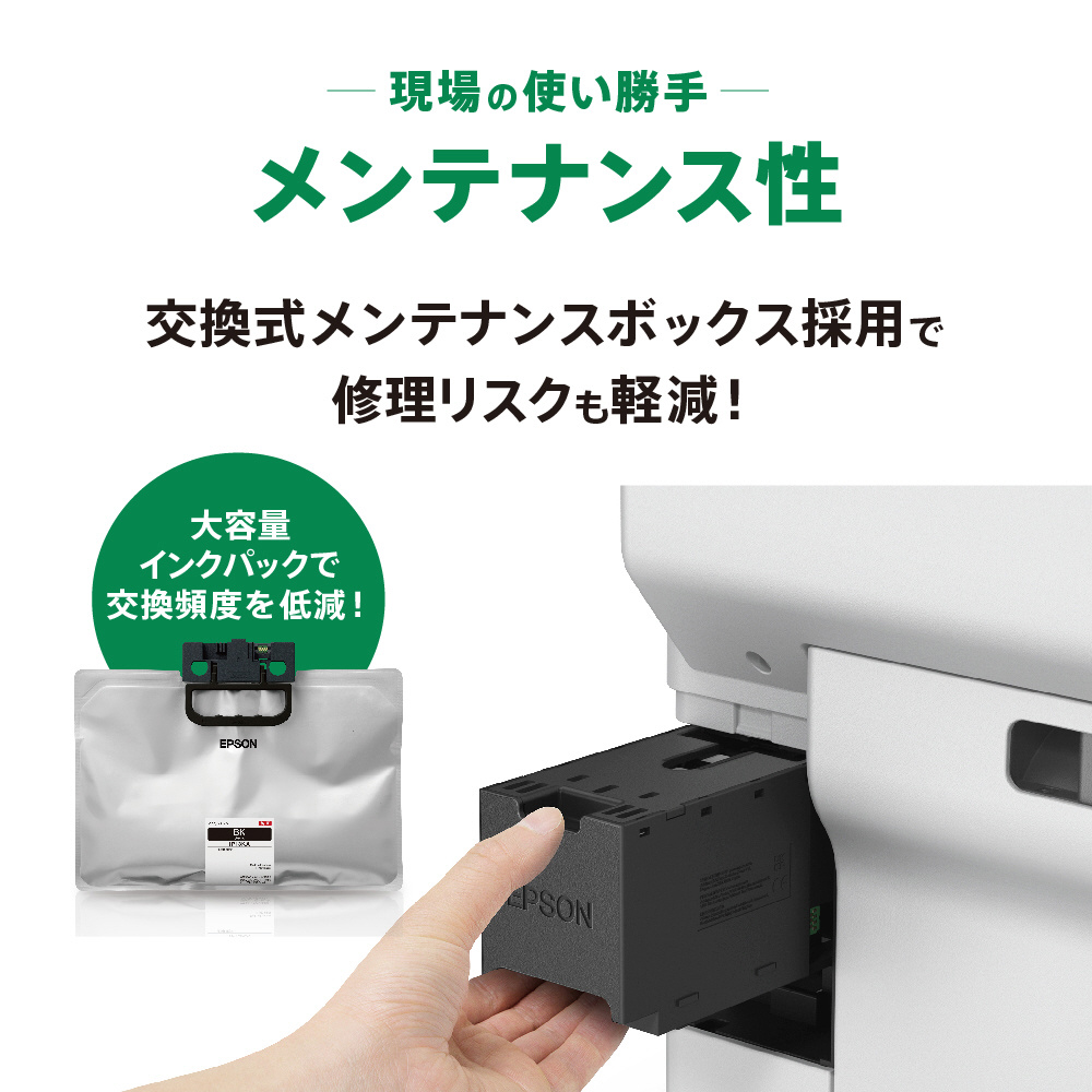 本体購入時に約35,000ページをプリントできる大容量インクパックを同梱。さらに、消耗品の購入や交換の手間を軽減します。