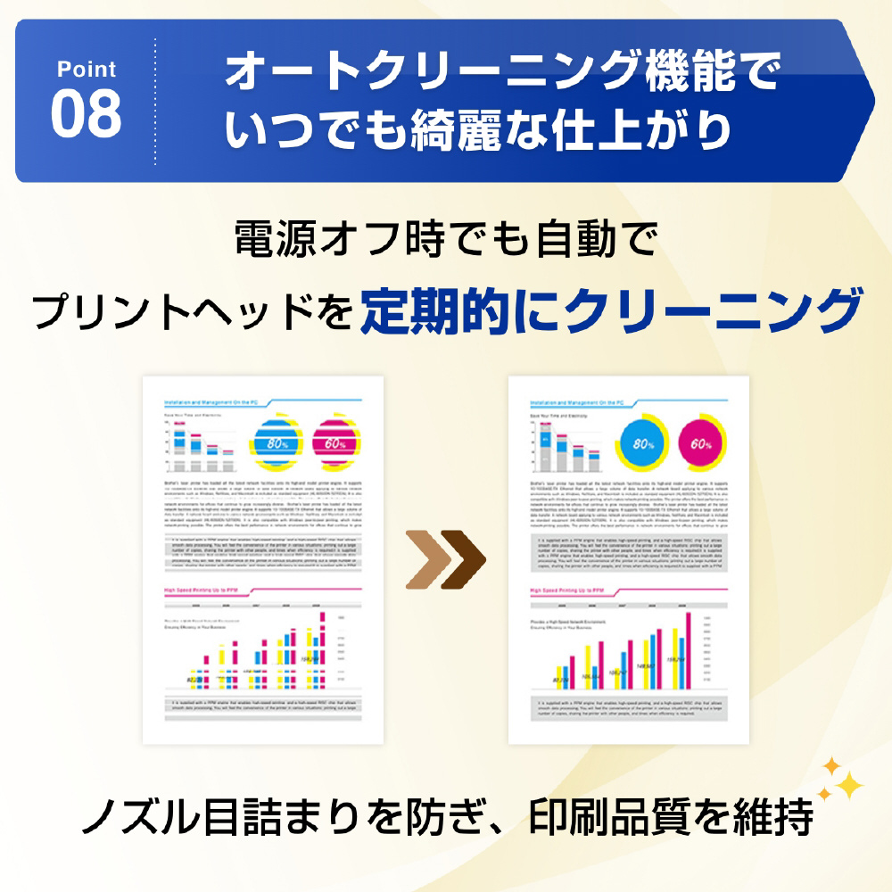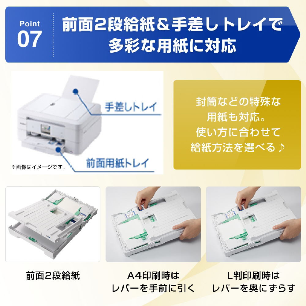 プリント、コピー、スキャン、ファクス、USB接続、スマホ接続、タッチパネル液晶、ADF(自動原稿送り装置)、自動両面プリント、CD/DVD/BDレーベルプリント、ダイレクトプリント、前面給紙トレイ、4色独立インク。