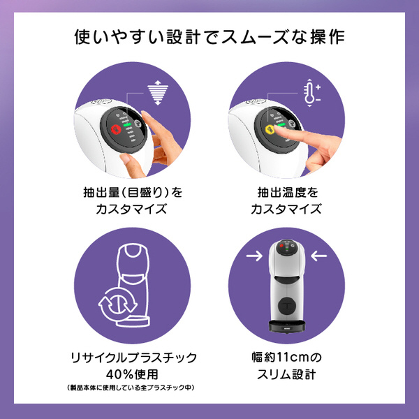 メインストリーム層向けに、横幅がスリムなボディに、XLサイズ抽出機能やIoT機能などの必要機能を搭載したモデルを発売する。 新アプリ「ネスカフェ ドルチェ グスト アプリ」に対応したマシンで、アプリと繋げて使うことにより、さらにおうちでのカフェ体験がアップグレード。また、製品本体に使用しているプラスチックのうち40%がリサイクルプラスチックで、サステナビリティにも配慮したモデル。