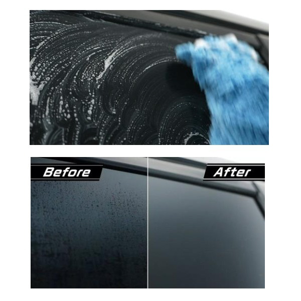 ●ファインセラミックパウダーとキレート剤のWの効果で、ボディの雨ジミ・垂れスジ、ガラスの油膜・しつこい汚れをこれ一本で徹底洗浄!