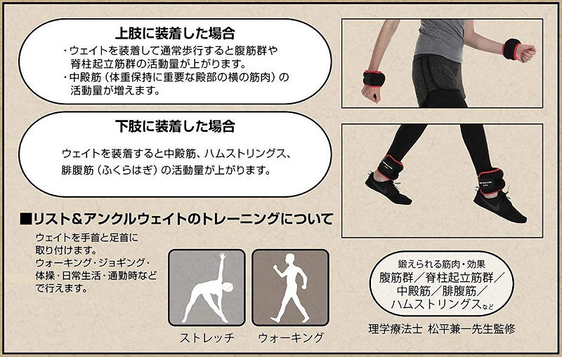ウエイトを装着して通常歩行をすると腹筋群や脊柱起立筋群の活動量が上がります。