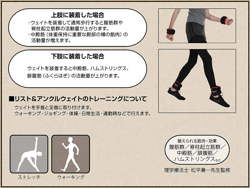 ウエイトを装着して通常歩行をすると腹筋群や脊柱起立筋群の活動量が上がります。