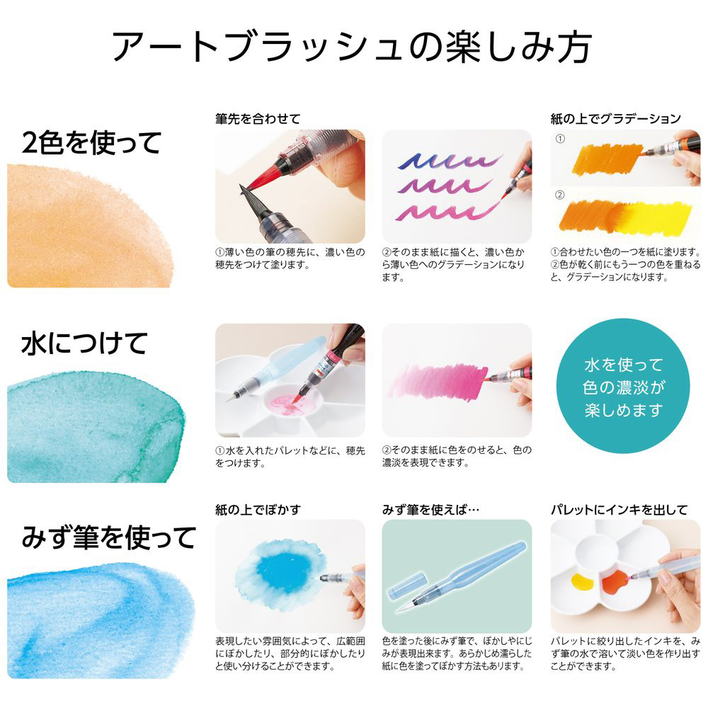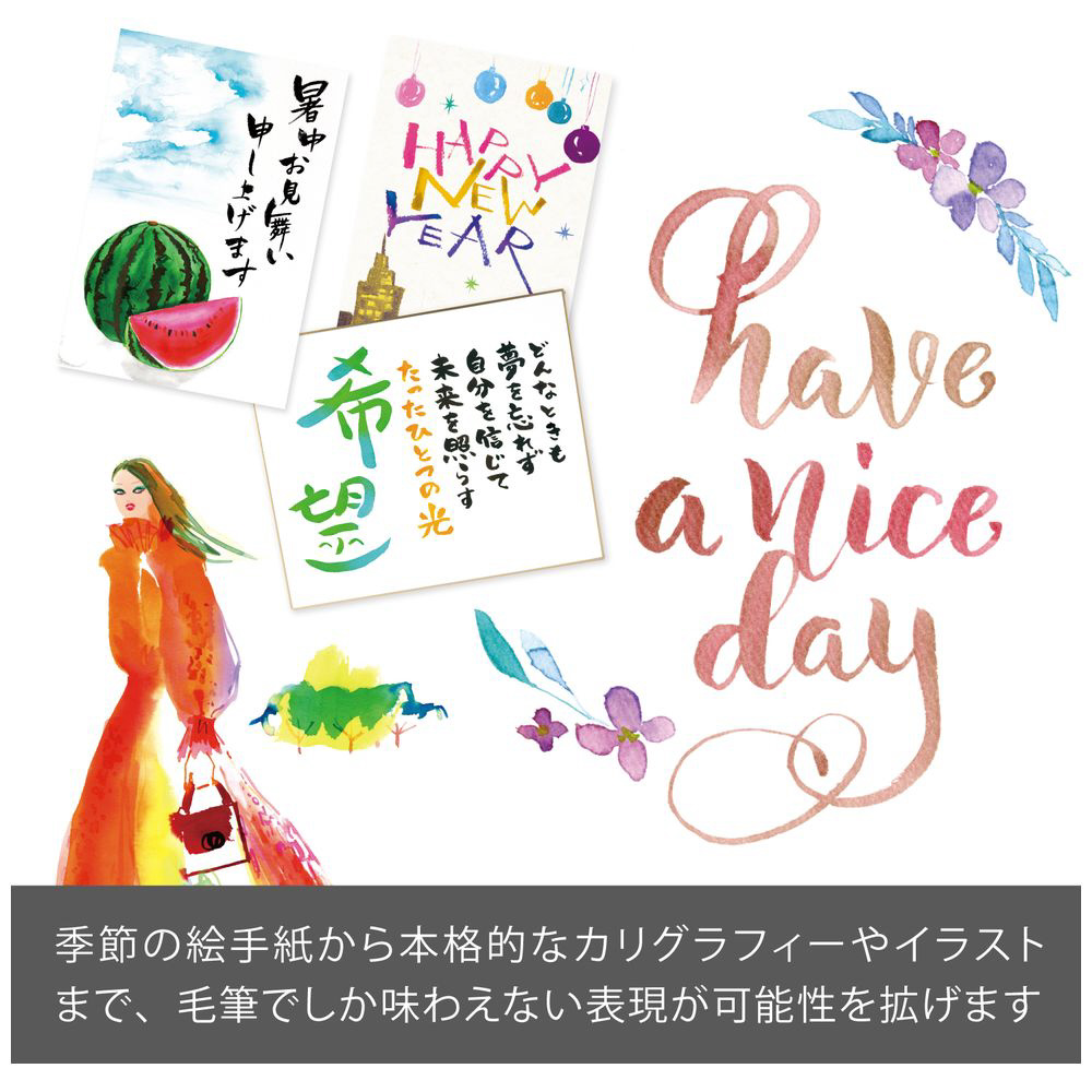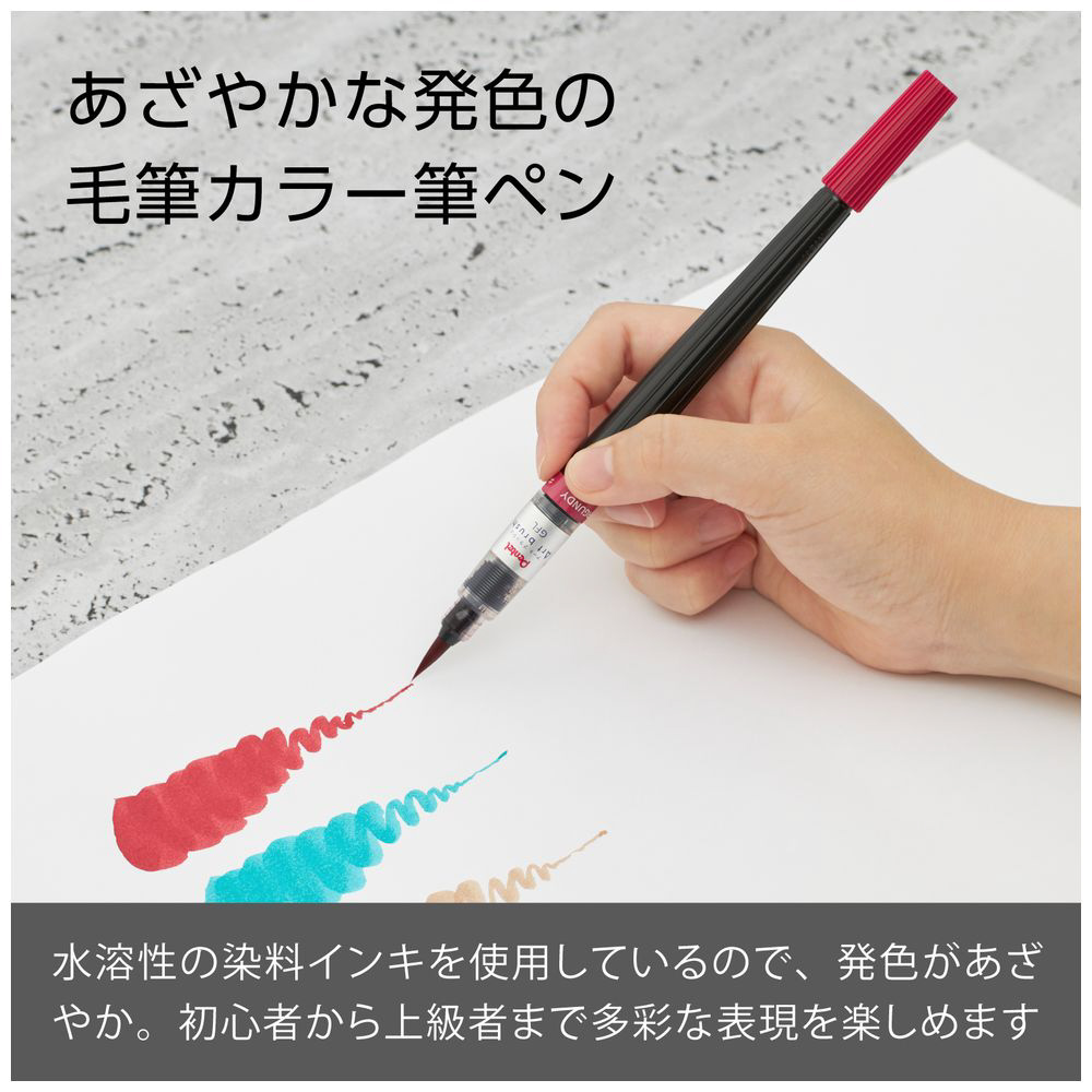 みずみずしく鮮やかな発色で、毛筆タイプならではの自由な表現ができるカラー筆。