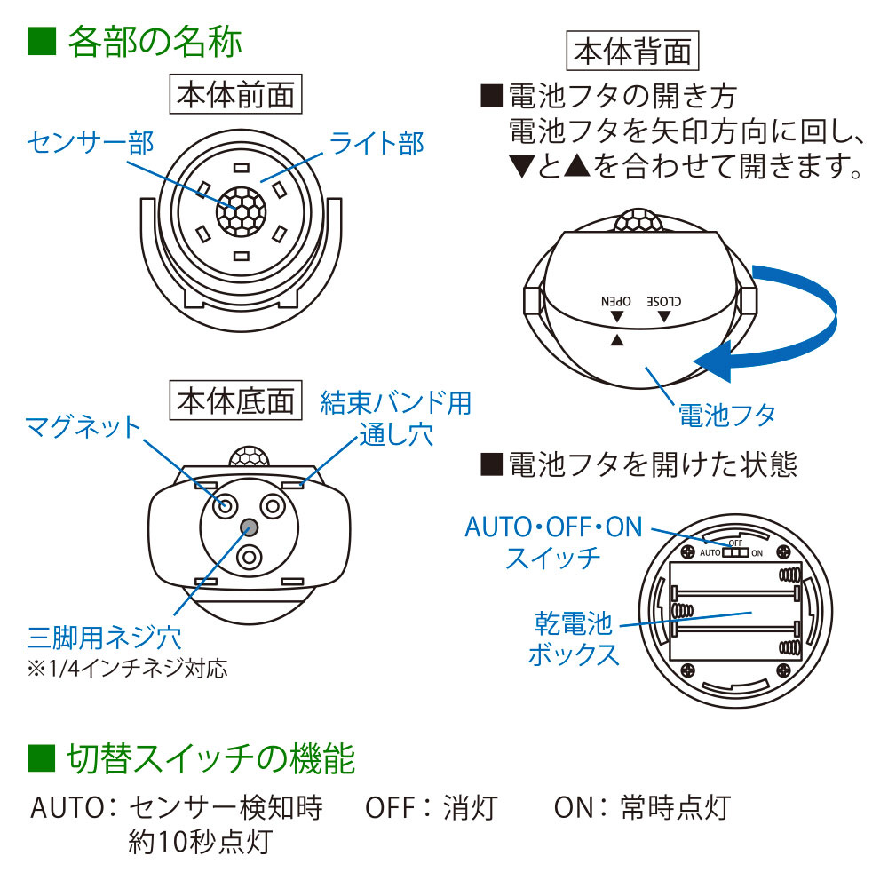 ■ 乾電池の寿命:AUTO…1日10回点灯の場合、約7か月使えます。ON…連続点灯約20時間(アルカリ乾電池使用時の目安)