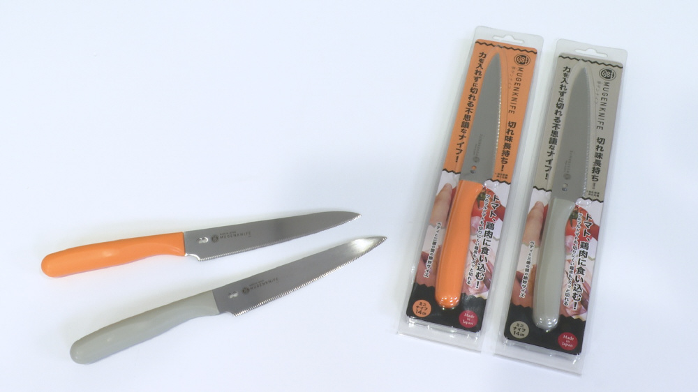 新開発の凹凸刃が力を入れず食材へ鋭く食い込み、柔らかいものから硬いものまで使える、力を入れずに切れる不思議なナイフ。