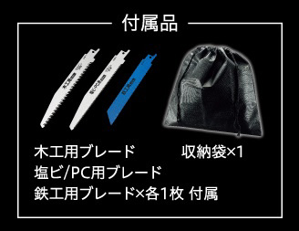 ●電気のこぎり本体 ×1 ●木工用ブレード ×1 ●塩ビ・PC用ブレード ×1 ●鉄工用ブレード ×1 ●六角棒レンチ ×1 ●収納袋 ×1 ●取扱説明書 ×1