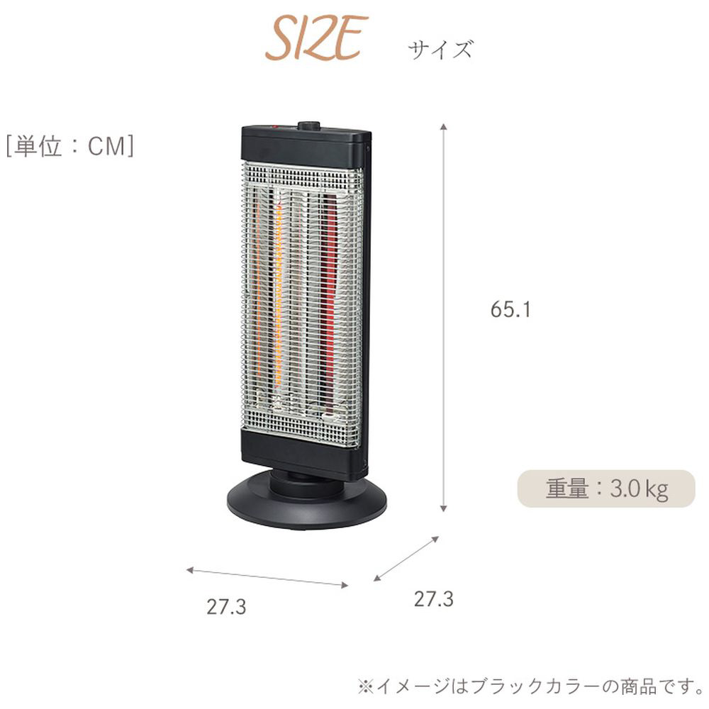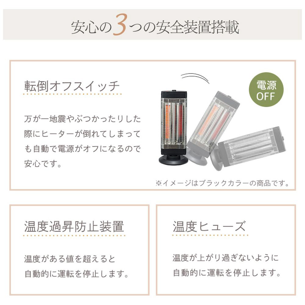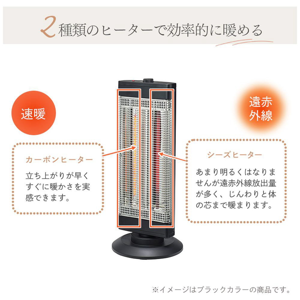 速暖カーボンヒーター×遠赤外線シーズヒーターのハイブリッドワイドカーボンヒーター。自動首振り機能でワイドな暖かさ。万一の転倒の際も安心の転倒オフスイッチ搭載。