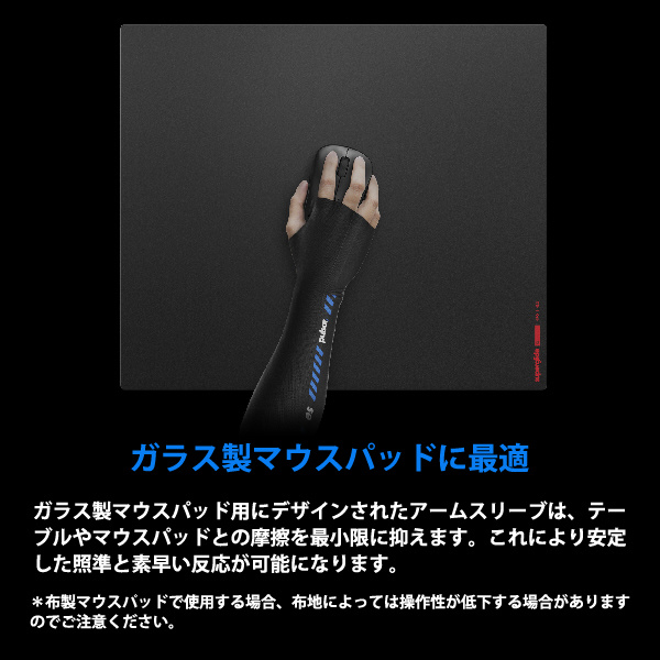 ガラス製マウスパッド用にデザインされたアームスリーブは腕とテーブルやマウスパッドとの摩擦を最小限に抑えます。これにより、安定した照準と素早い反応が可能になります。
