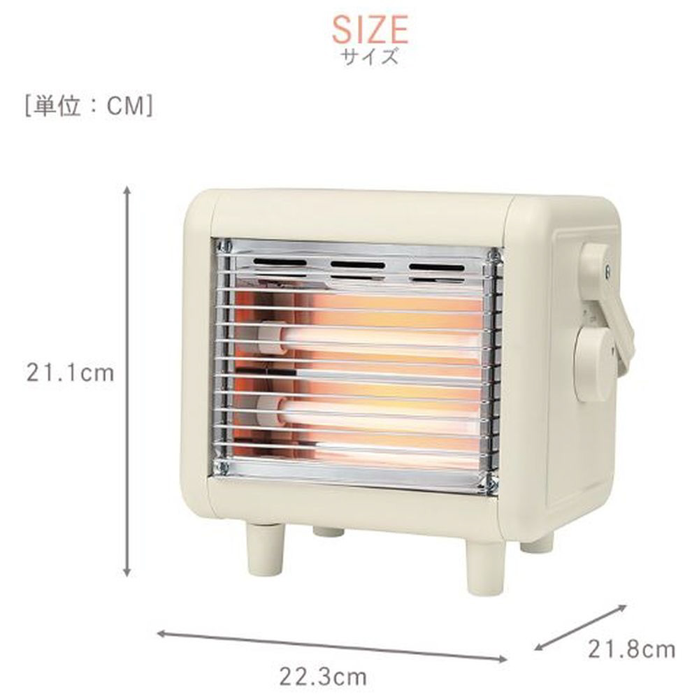 コンパクトでかわいいパーソナルミニストーブ。低消費電力で省エネ。ダイヤル式でシンプルな操作部。万一の転倒時も安心の自動オフスイッチ付き。