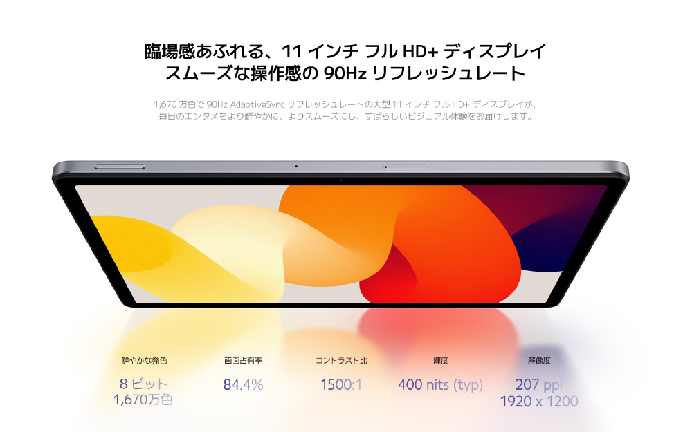 | 仕様1 | [ディスプレイ] 11 インチ FHD+ ディスプレイ 解像度:1920 x 1200、207ppi リフレッシュレート:最大 90Hz 輝度:400 nit(typ) TUV Rheinland 低ブルーライト認証(ソフトウェアソリューション) TUV Rheinland フリッカーフリー認証 タッチサンプリングレート:最大 180Hz 画面占有率:84.4% コントラスト比:1500:1 色域:70% NTSC 色深度:8 ビット、1670 万色 |
