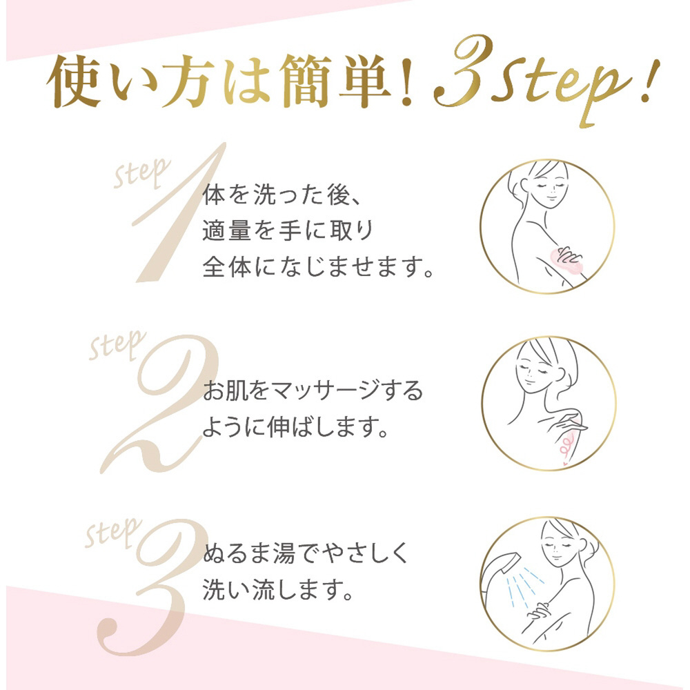 ●体を洗った後、適量を手に取り、円を描くようにやさしくマッサージした後、よくすすいで下さい。