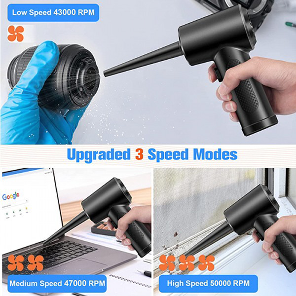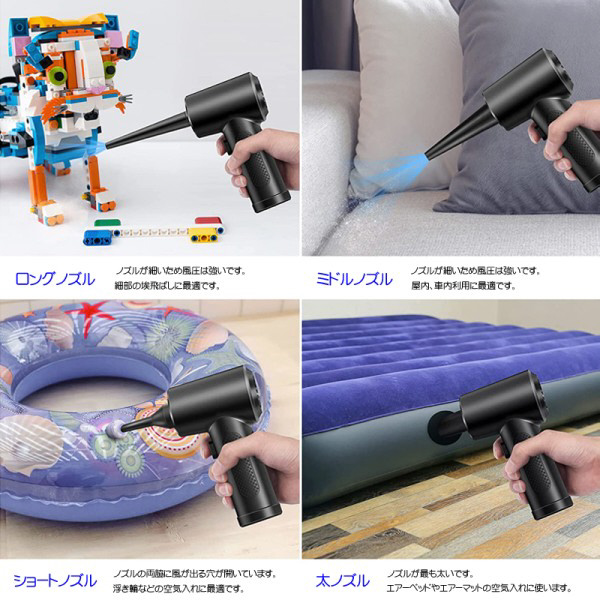 ガンタイプの充電式電動エアダスターです。5種類のノズルが付属。LEDライト搭載で細かな汚れも見逃しません。風量を3段階で調整可能。浮き輪やエアマットなどの空気入れに使う事も出来ます。