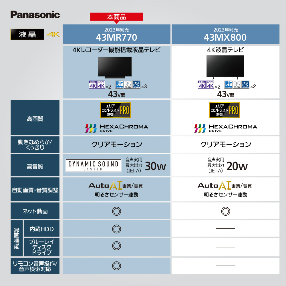 液晶テレビ VIERA(ビエラ) TH-43MR770 [43V型 /4K対応 /BS・CS 4Kチューナー内蔵 /ブルーレイ内蔵 /YouTube対応 /Bluetooth対応]