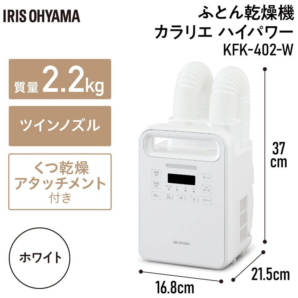 | 商品名 | 布団乾燥機 ハイパワーツインノズル ホワイト KFK-402-W [マット無タイプ /ダニ対策モード搭載] 【864】 |