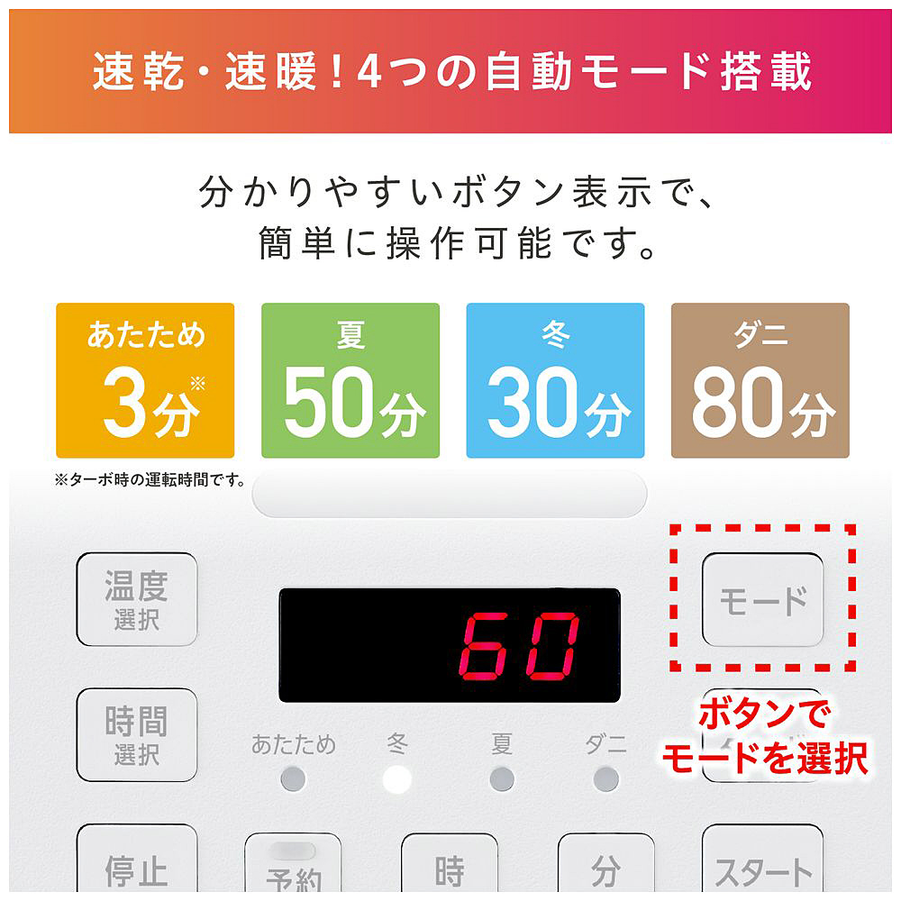 【ターボモード】風量がアップし、3分でふとんあたため、30分で乾燥が可能です。
