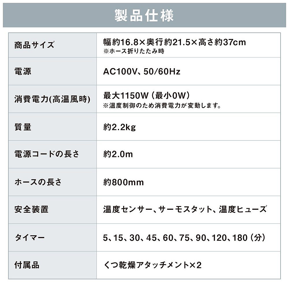 | タイマー | 3、15、30、45、60、75、90、120、180分 |