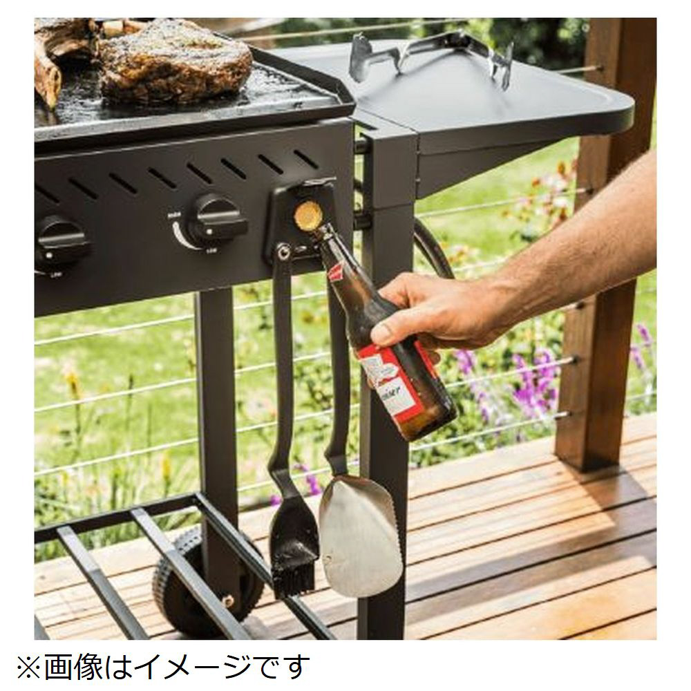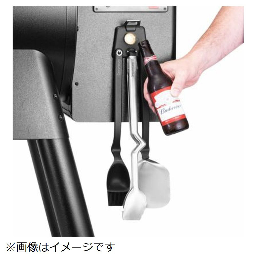 ステンレストング、BBQ トング、BBQ ブラシ、ビンオープナー、ツールホルダーが揃います。ツールホルダーには磁石が付いており、BBQ 台にツールを下げておくことができるので便利です。