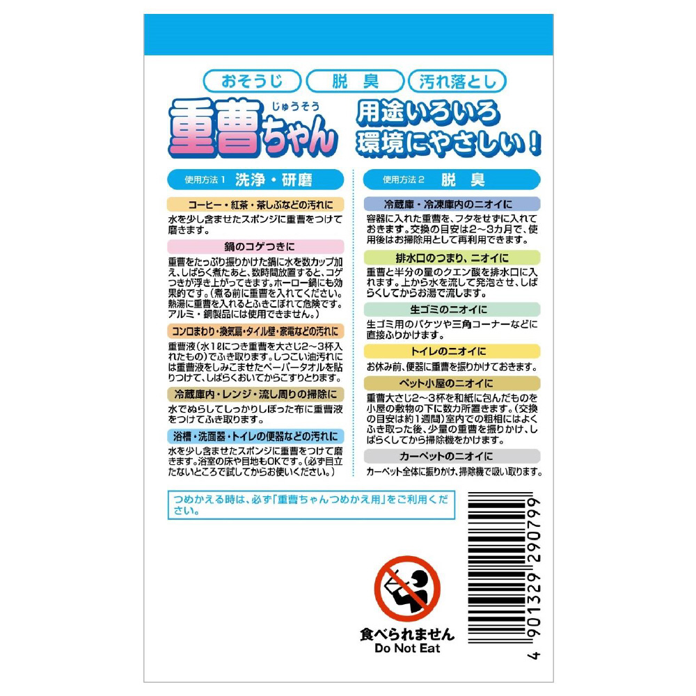 ガンコな焦げ汚れもしっかり落とします。脱臭やおそうじなどいろいろな場面で大活躍。環境にやさしく、安心、便利な重曹です。ボトルタイプなので重曹ちゃんをつめかえれば何度でも繰り返し使用できます。