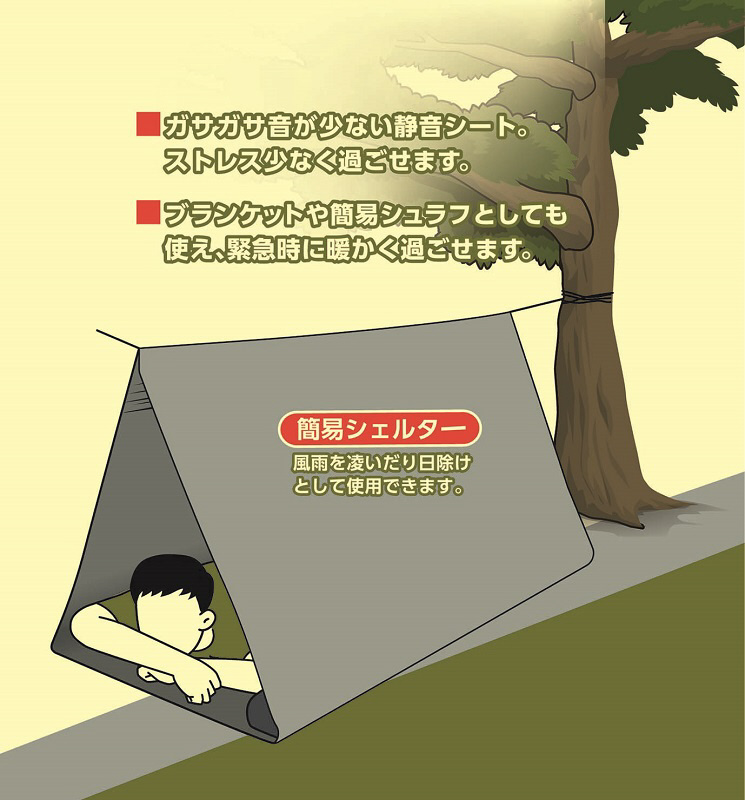 キャンプやレジャー、災害などの備えに。筒状シートにロープを通して簡易シェルターに。ガサガサ音が少ない静音シート。ストレス少なく過ごせます。ブランケットや簡易シュラフとしても使え緊急時に暖かく過ごせます。