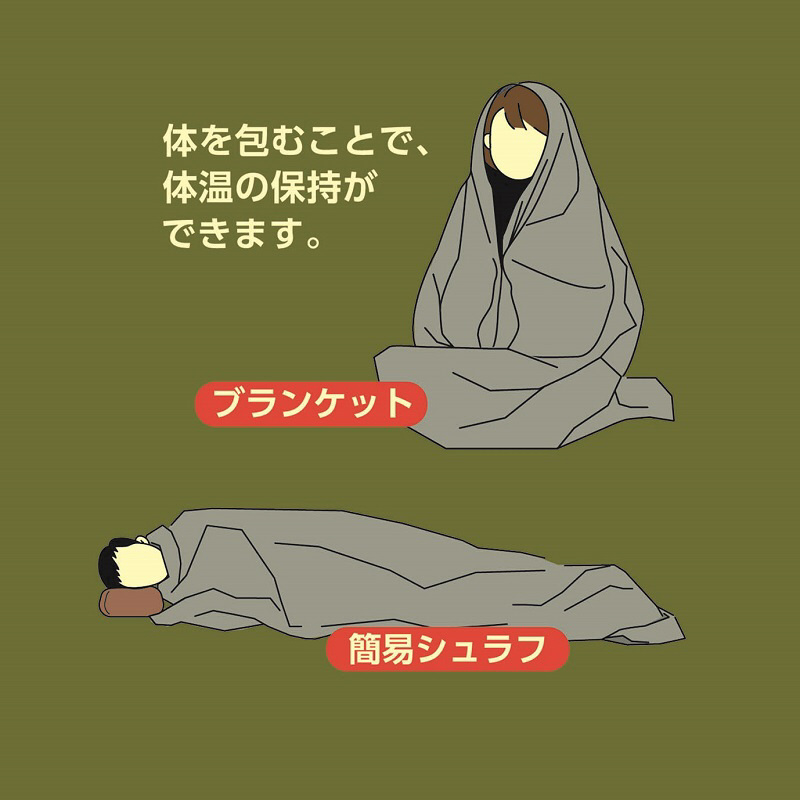 ブランケットや簡易シュラフとしても使え緊急時に暖かく過ごせます。