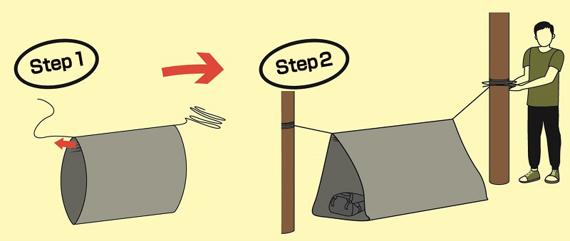 筒状シートにロープを通して簡易シェルターに。