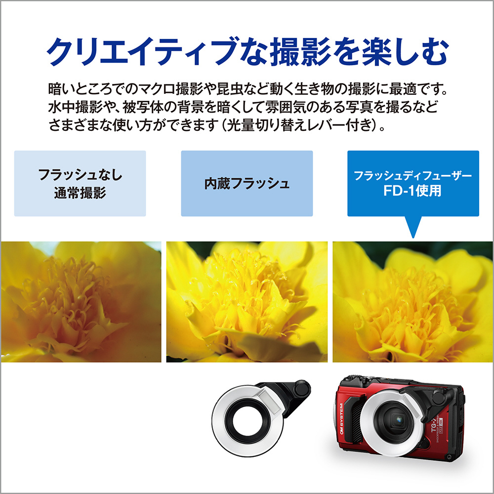 水中撮影の可能性をさらに広げるため、「Tough TG-7」には「水中ワイド」「水中スナップ」「水中マクロ」「水中顕微鏡」「水中 HDR」の5つの水中撮影モードを搭載、それぞれの状況に応じた最適な撮影設定に切り替わります。好評の水中ホワイトバランスも3種類に進化し、水深に応じたより適切な色調が得られます。さらに全周魚眼撮影が可能になる新しいフィッシュアイコンバーター「FCON-T02」をはじめとした多彩なアクセサリーが撮影の幅を大きく広げます。