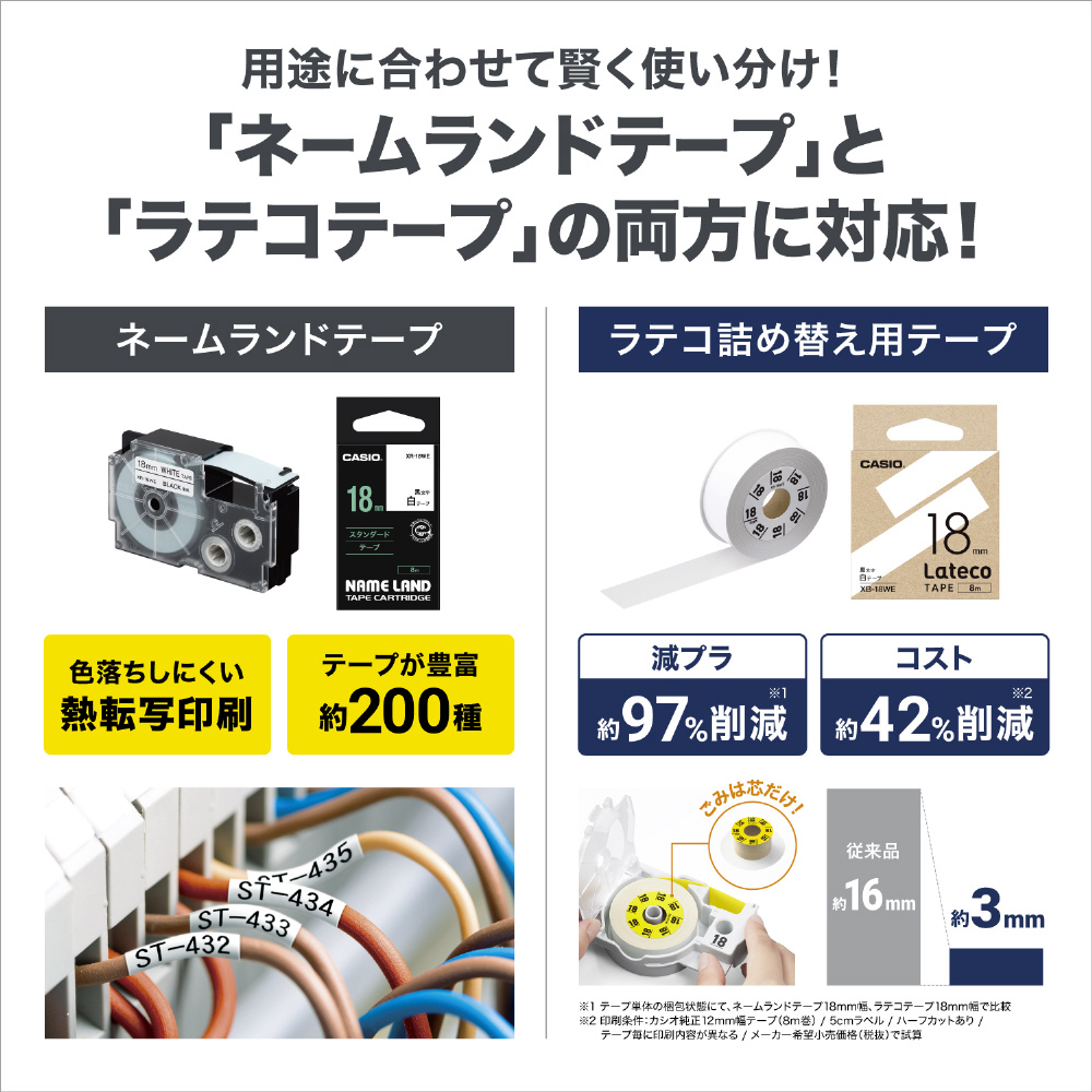 | 使用テープ幅 | ネームランド:3.5mm〜46mm、ラテコ:6mm〜24mm |