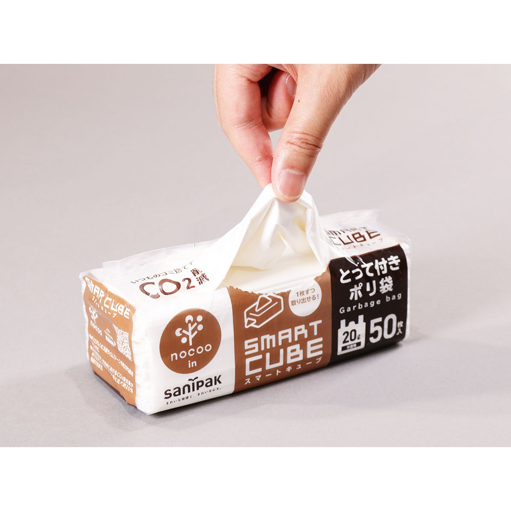 スマートキューブ nocoo inは、通常包装の1/4(本袋を1/32)に折りたたんだコンパクト包装で、かつBOXタイプ(ティッシュタイプ)の外装に収納されたポリ袋シリーズの名称です。上と横に取り出し口が付いており、ティッシュのように一枚ずつ取り出すことが出来ます。