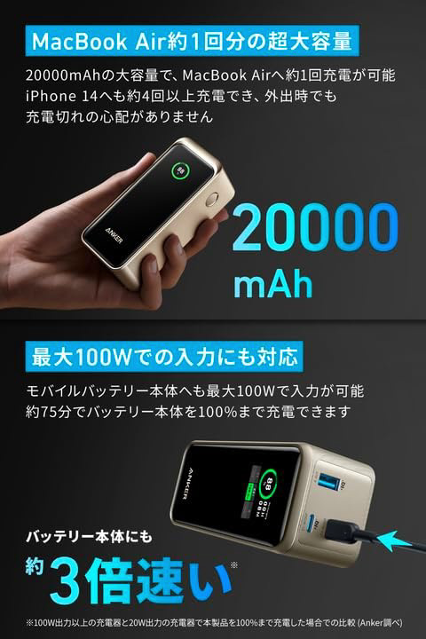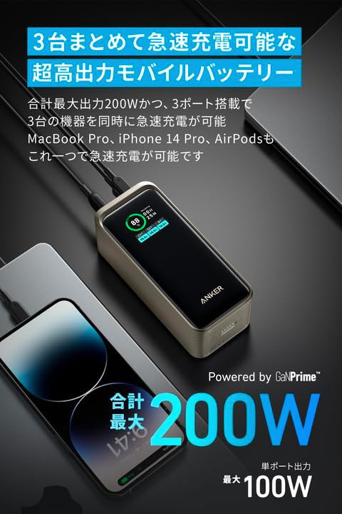 モバイルバッテリー Anker Prime Power Bank (20000mAh、200W) 付属ケーブル長: 0.6m ゴールド A13360B1 [USB Power Delivery対応 /3ポート]