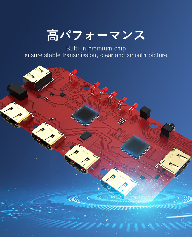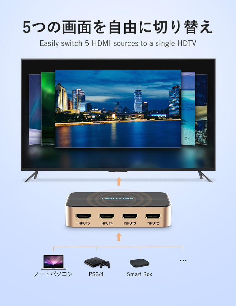 5つの画面を自由に切替え : HDMIスイッチボックスを使用すると、5台のHDMIソースデバイスを1台のテレビ/ディスプレイ/モニターに入力できます。